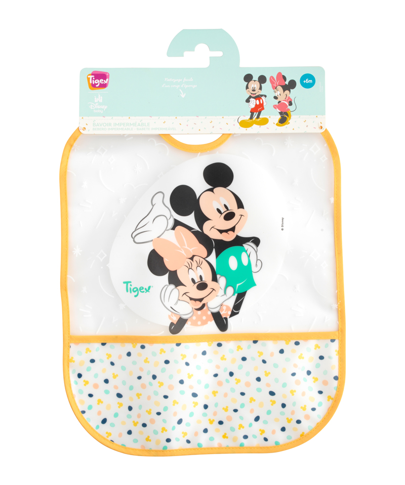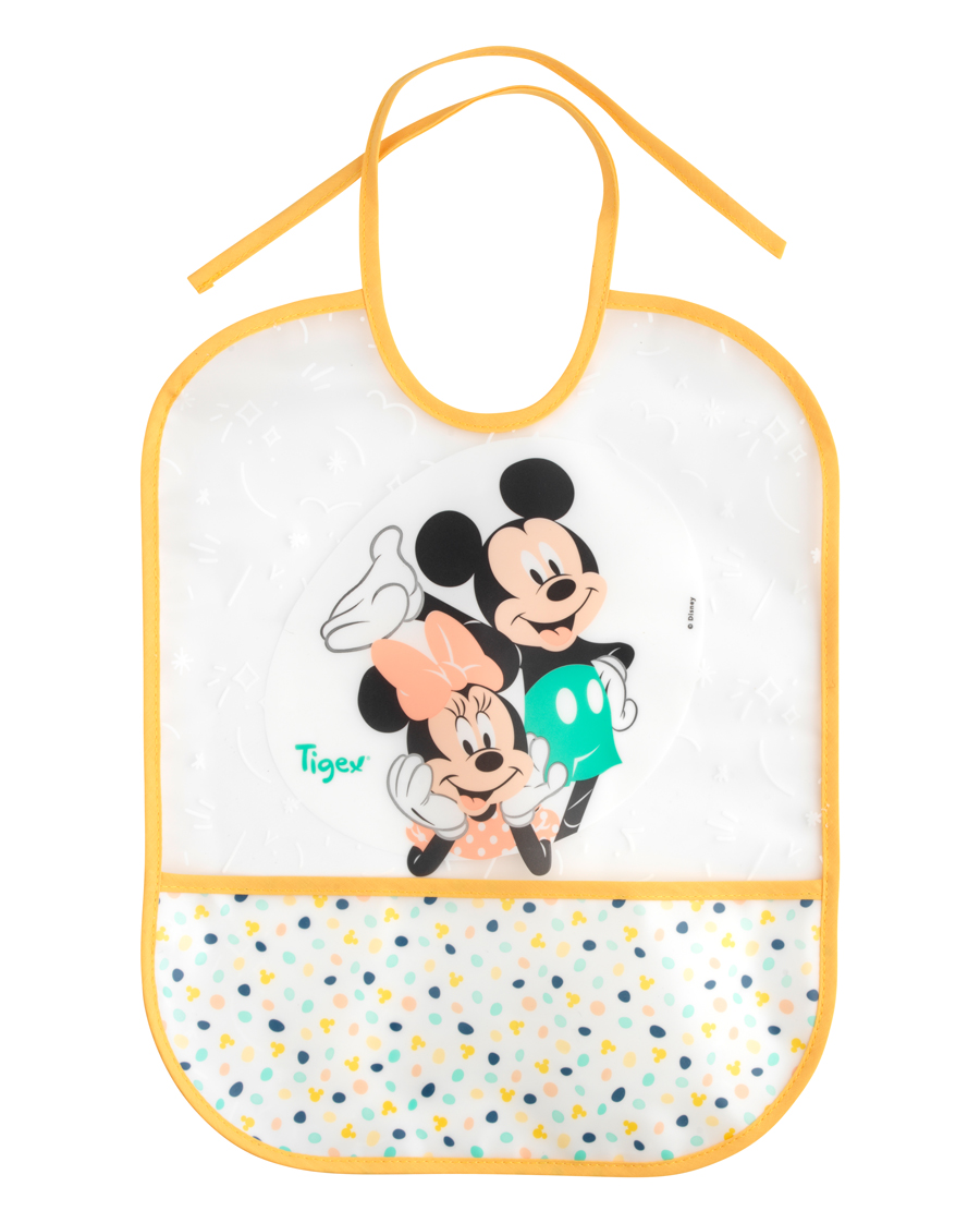 Este babero de Mickey impermeable y flexible es fácil de limpiar con una esponja. Con su bolsa de recolección de basura, es muy conveniente.