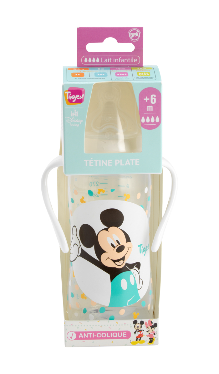 Biberón de 300ml con asas ergonómicas “Autonomía+” que ayudan al bebé a beber solito.
